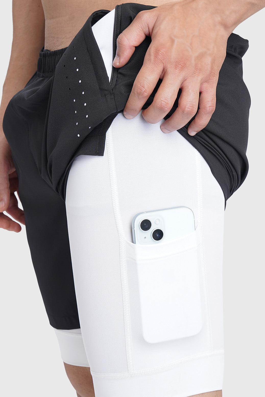 The 2-in-1 Laser Shorts in Black are engineered for serious training, offering a sleek regular fit with a 6” inseam and dual-layer functionality. Built from water-resistant woven fabric, the outer layer is enhanced with laser-cut ventilation on both sides for advanced breathability, while the inner compression tights provide targeted support and feature a secure phone pocket.
