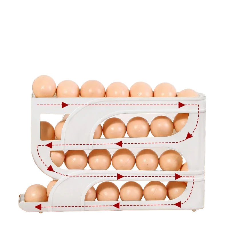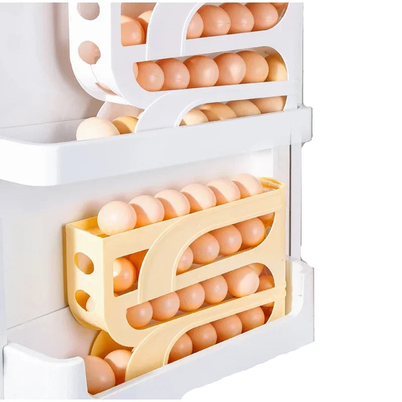 Keep your refrigerator neat and your eggs easily accessible with the 4-Layer Automatic Rolling Egg Holder Rack.