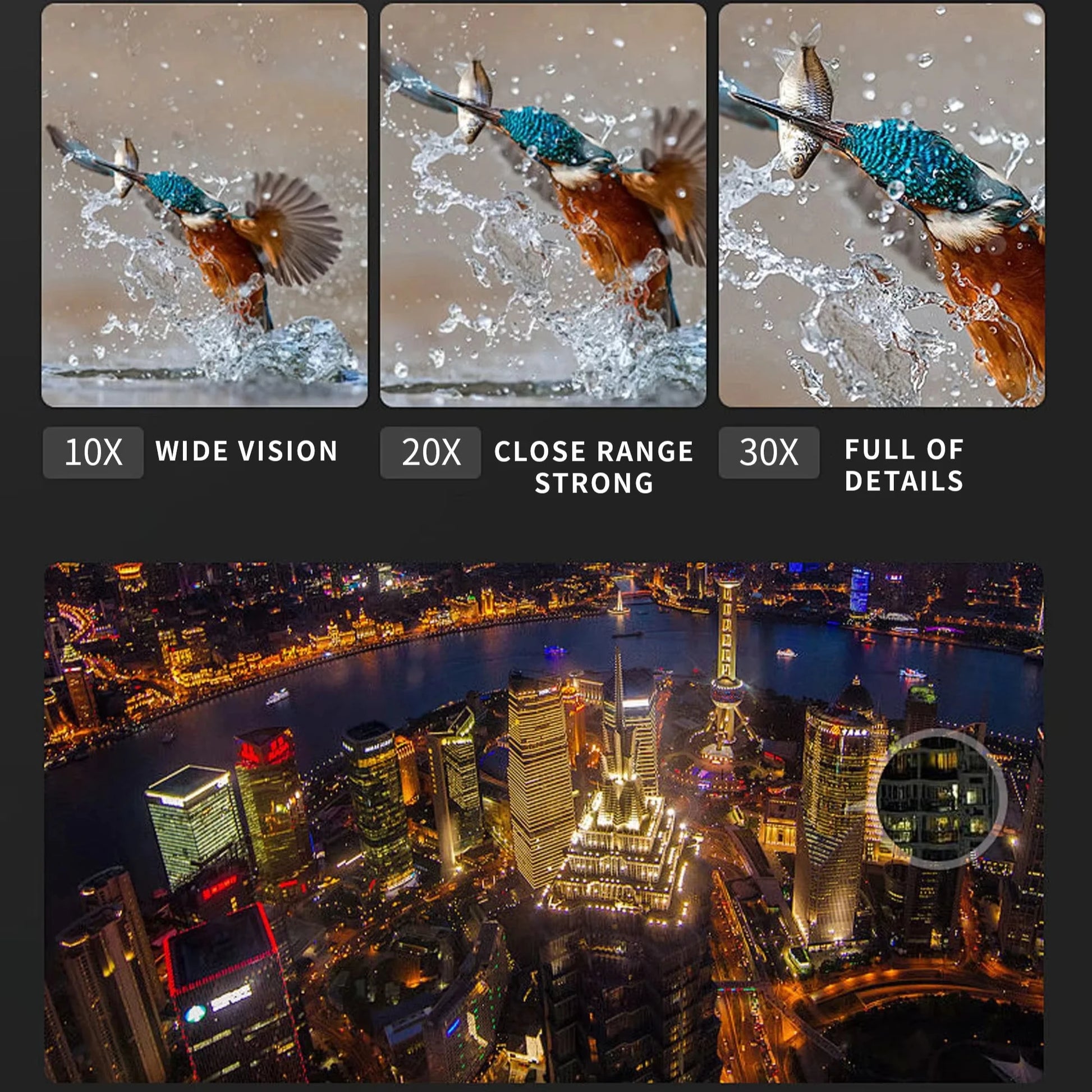 10-30X Adjustable Magnification: Flexible zoom to view objects at various distances with clarity.