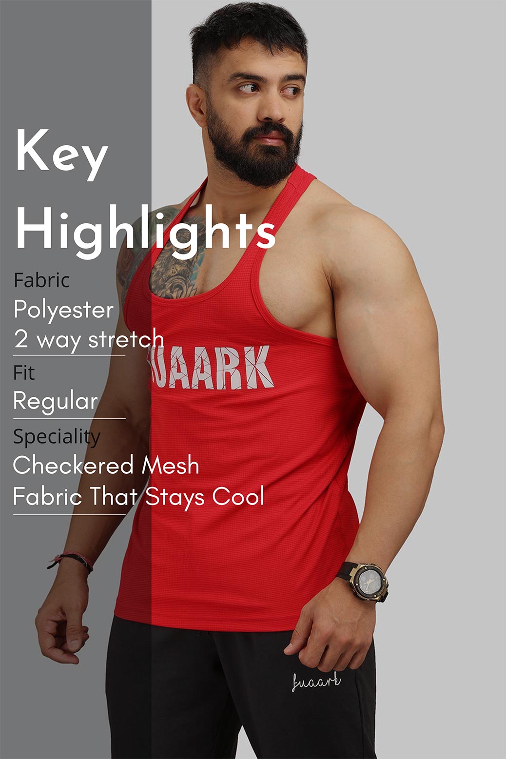 Unleash your inner athlete with the Fuaark Classic Stringer in Red. Designed with a regular fit, this stringer provides ultimate comfort and freedom of movement. The checks mesh fabric promotes ventilation, keeping you cool during your most intense workouts. The thin shoulder straps rest just above the traps, allowing you to show off your hard work while ensuring maximum mobility. Whether you're lifting, running, or hitting the gym, this stringer combines style and function effortlessly.