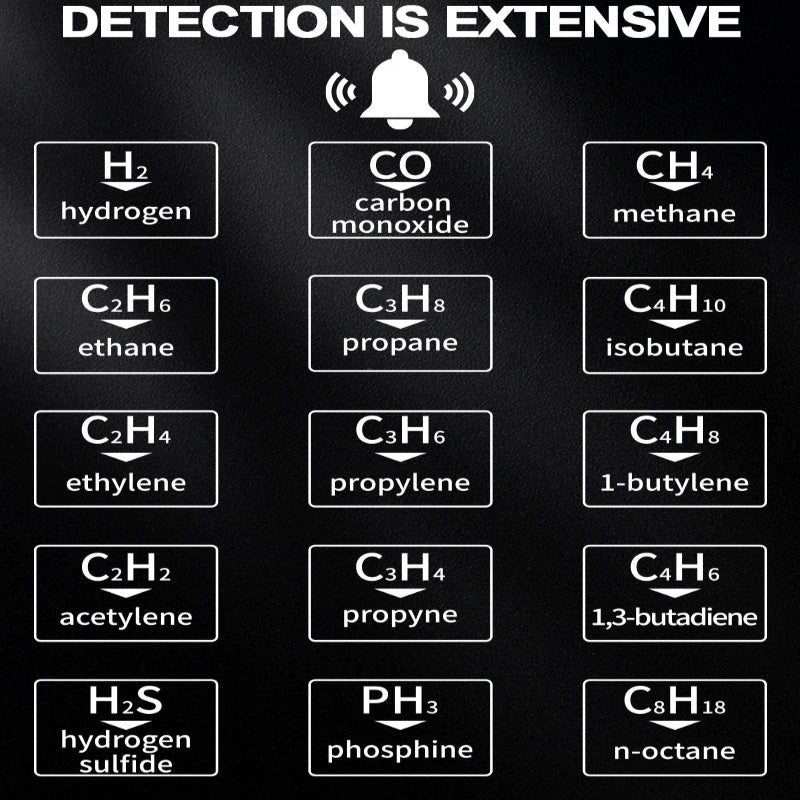 Detects combustible gases including methane, propane, butane, hydrogen, carbon monoxide, and more.