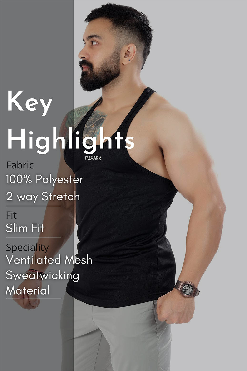 Elevate your workout wardrobe with the Fuaark Mesh Stringer in Black. Featuring a steeped hemline design and a tapered fit, this stringer is made to provide a sleek, athletic look while allowing maximum freedom of movement. The cool-to-touch fabric ensures you stay comfortable even during the most intense workouts, and the lox cut neckline and open razor back enhance breathability, making it perfect for weightlifting, cardio, or outdoor activities. The mesh construction allows for superior ventilation, keeping you dry while you push through your training.