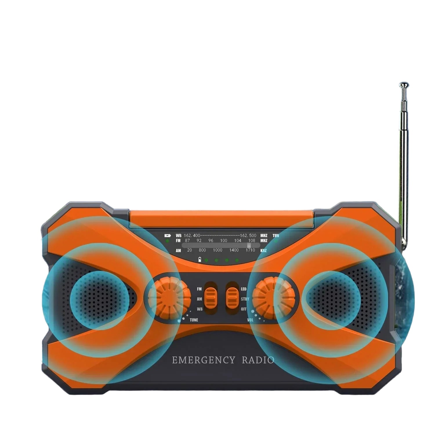Equipped with a 10000mAh rechargeable battery, dual stereo speakers, solar and hand-crank charging, LED flashlight, and NOAA weather alert functionality, this compact device ensures you stay powered, informed, and safe wherever you go.